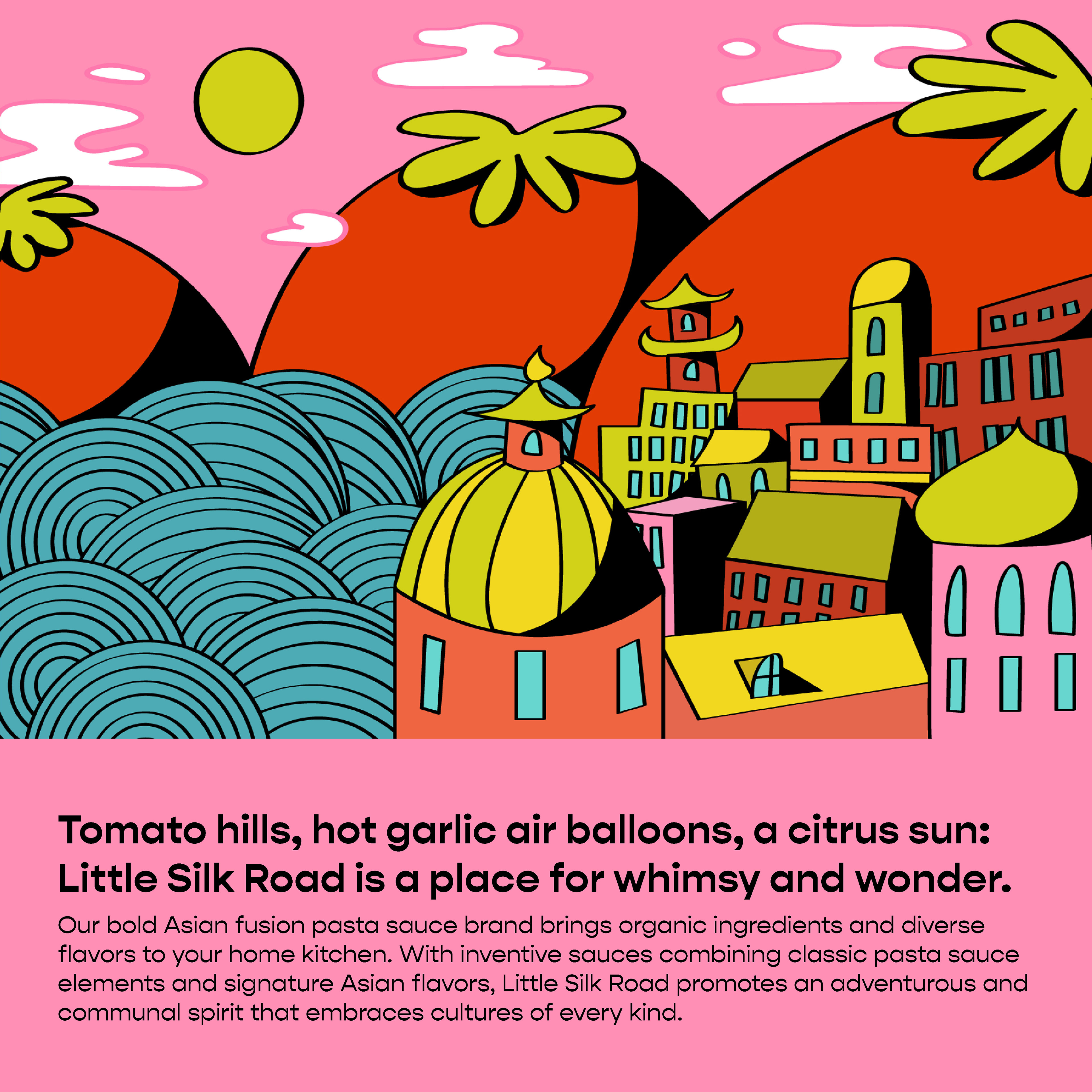 How do you sell yet another pasta sauce brand? Many classic pasta sauce brands rely on being classical, reliable, and nostalgic, but we wanted to make Little Silk Road stand out as boldly as its flavors. With a bright color palette, elements that tie back to Asian heritage, and bespoke illustrations, I developed a modern brand identity for an adventurous audience. The concept of travel in the packaging designs lean into this direction while promoting community and acceptance between East and West cultures.